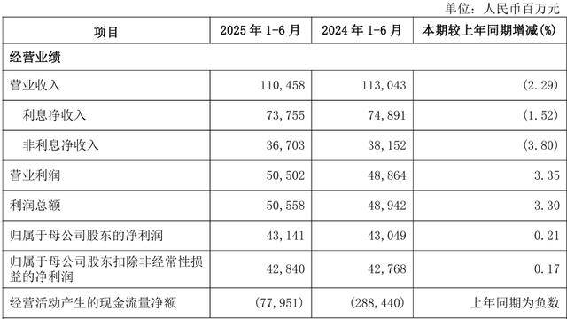 兴业银行(601166.SH)发布2025年半年度报告。报告期内,公司实现营业收入1,104.58亿元,同比下降2.29%,降幅较一季度收窄1.29个百分点。实现归属于母公司股东的净利润431.41亿元,同比增长0.21%,增速较一季度由负转正。